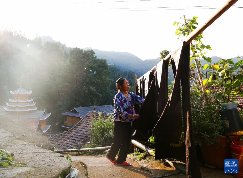 乌英苗寨妇女梁足英在晾晒第一次浸染后的布料(2023年8月31日摄)。