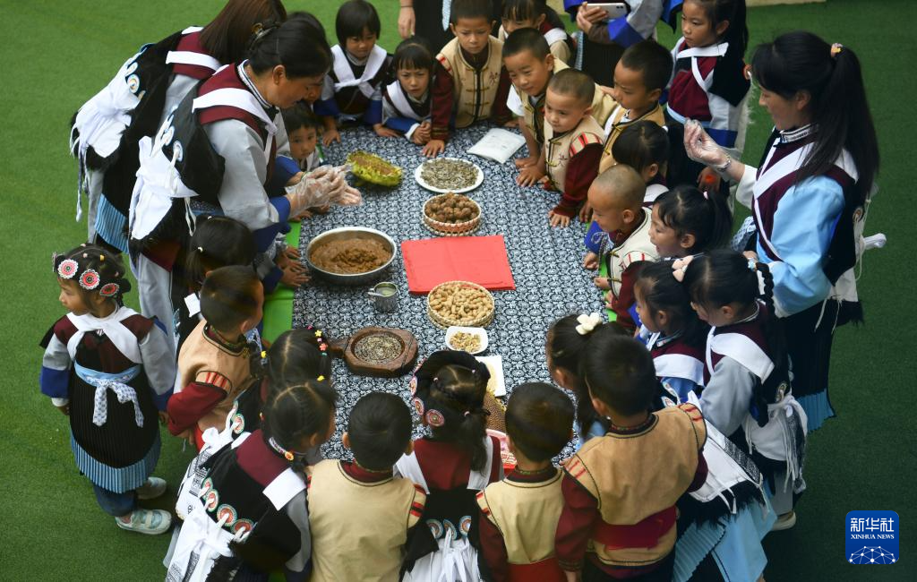 9月27日,云南省丽江师范高等专科学校附属新苗幼儿园的小朋友在老师的指导下制作月饼。