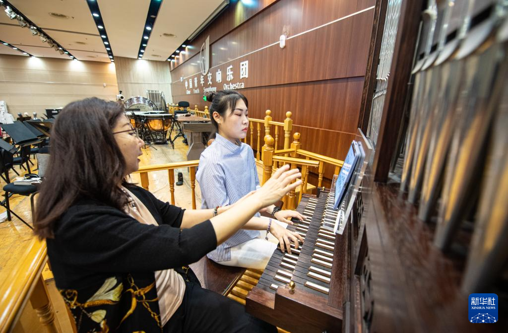 9月14日,在位于北京的中央音乐学院,沈凡秀教授(左)指导管风琴专业学生练习莫扎特的《F小调幻想曲 K.608》。