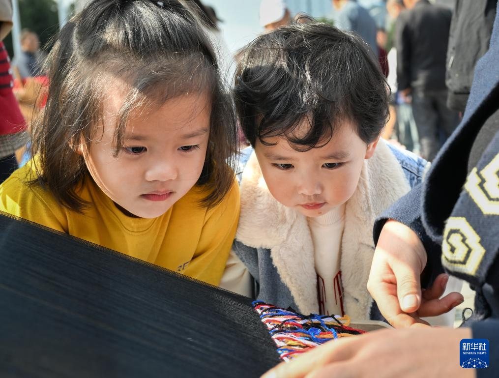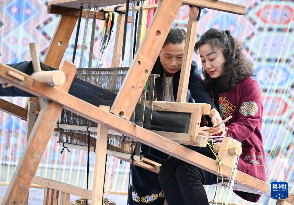 当日,数十名织锦女工在湖北省来凤县龙凤文化中心广场现场进行“西兰卡普”制作,普及非遗文化。