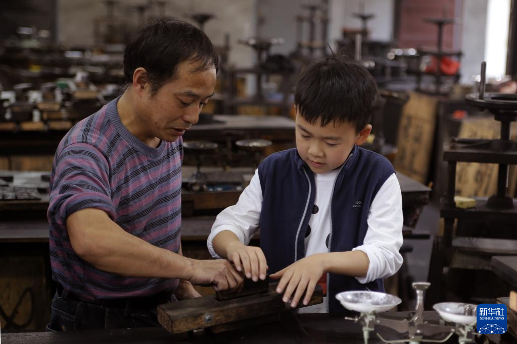10月24日,周健的儿子周墨(右)在工人的指导下制作徽墨。