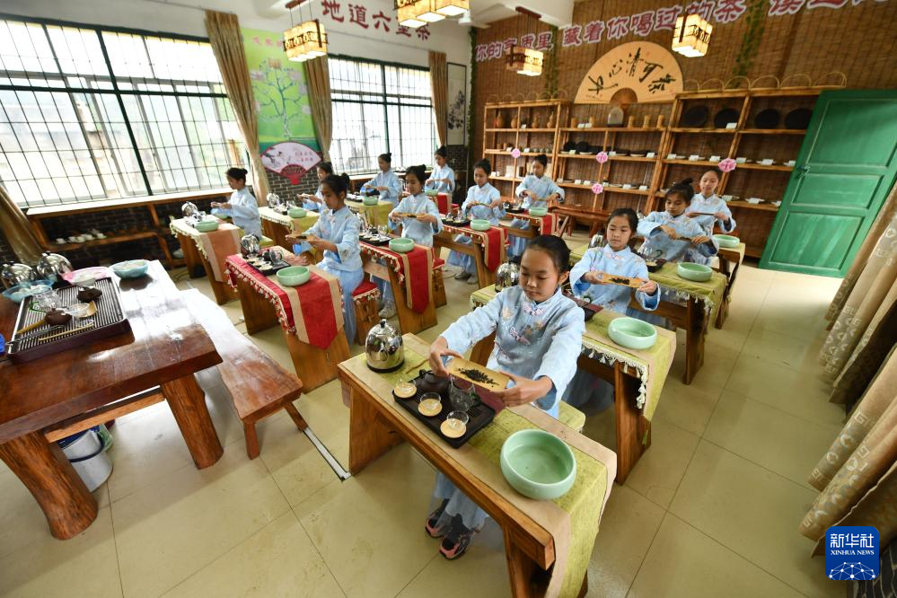 梧州市苍梧县六堡镇中心校的小学生在学习茶艺(3月29日摄)。