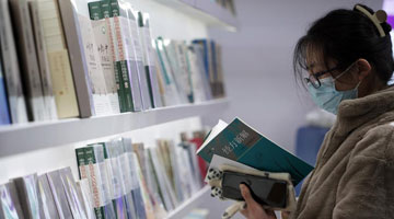 1月15日,河北省石家庄市裕华西路小学的学生在校园庙会活动中展示自己剪的窗花。