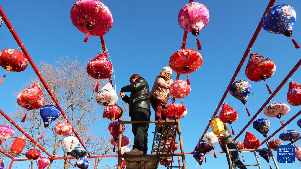 1月24日,工人在河北省石家庄市正定古城南城门安装花灯。