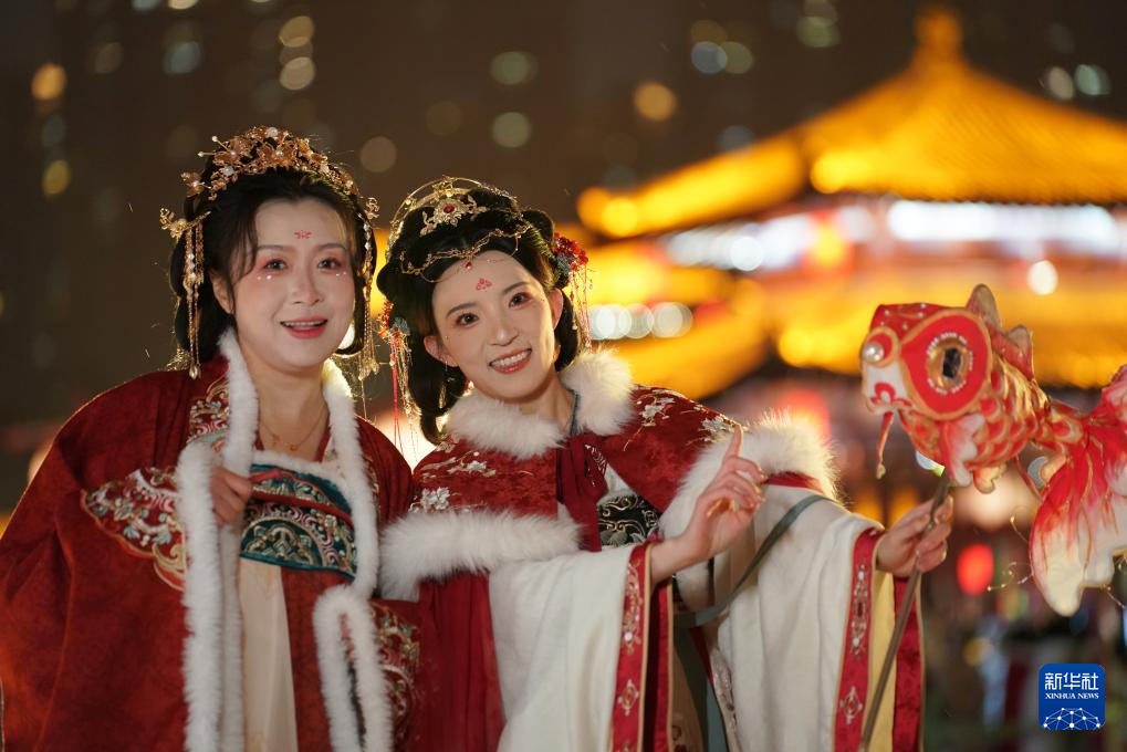这是2月2日拍摄的西安大唐不夜城景色(无人机照片)。