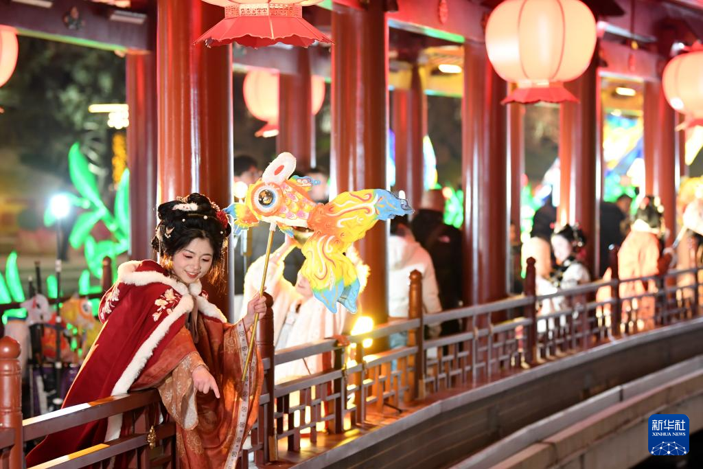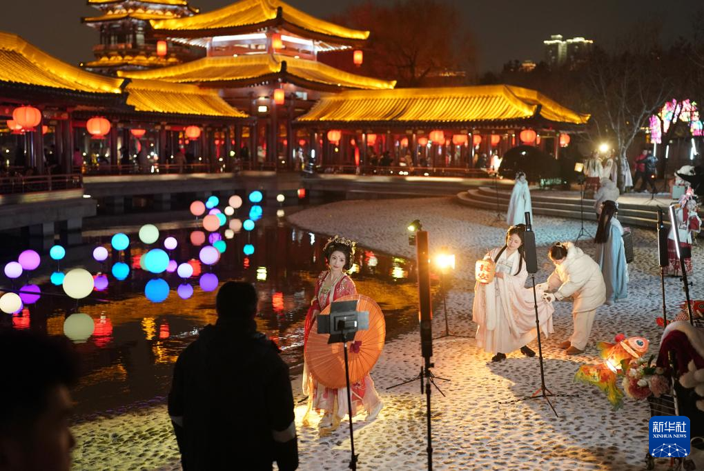 2月2日,游客在西安大唐芙蓉园内拍照游玩。