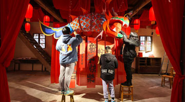 2月6日,黄山市歙县瞻淇村村民在布置鱼灯馆。