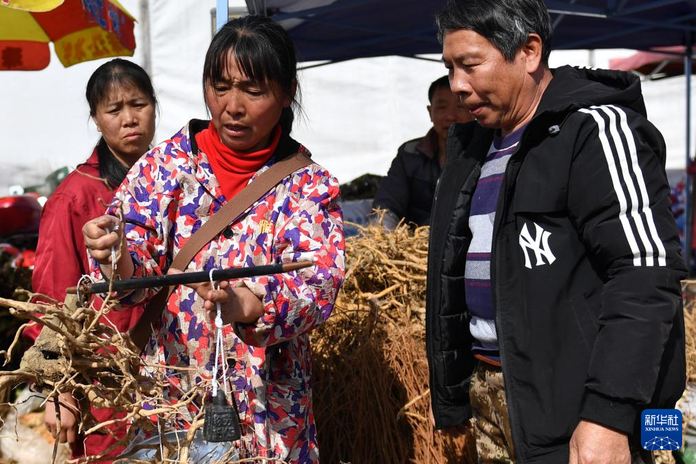 3月19日,消费者在安仁县中草药交易集市挑选中草药。