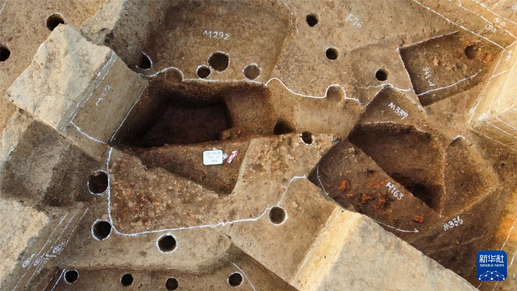 图为磨盘山遗址马家浜文化晚期房址发掘现场(2023年12月1日摄,无人机照片)。