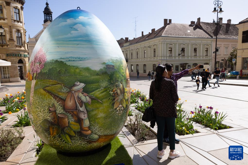 3月30日,人们在匈牙利南部城市佩奇街头参观复活节巨型彩蛋。新华社发(弗尔季·奥蒂洛摄)