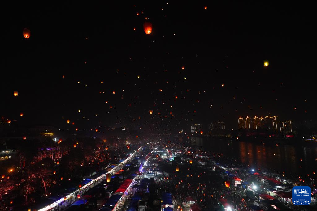 这是4月13日晚在云南省景洪市澜沧江边拍摄的孔明灯。