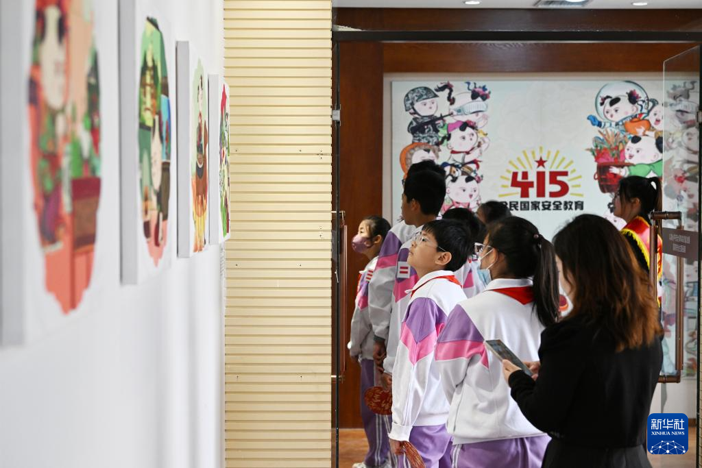 4月15日,小学生在参观国家安全年画娃娃艺术展。