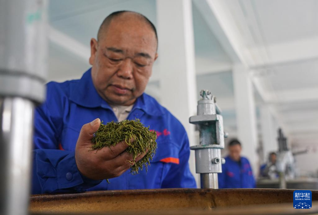 江西省修水县漫江乡的宁红茶制茶基地,俞旦华将茶叶进行机械烘干(3月29日摄)。