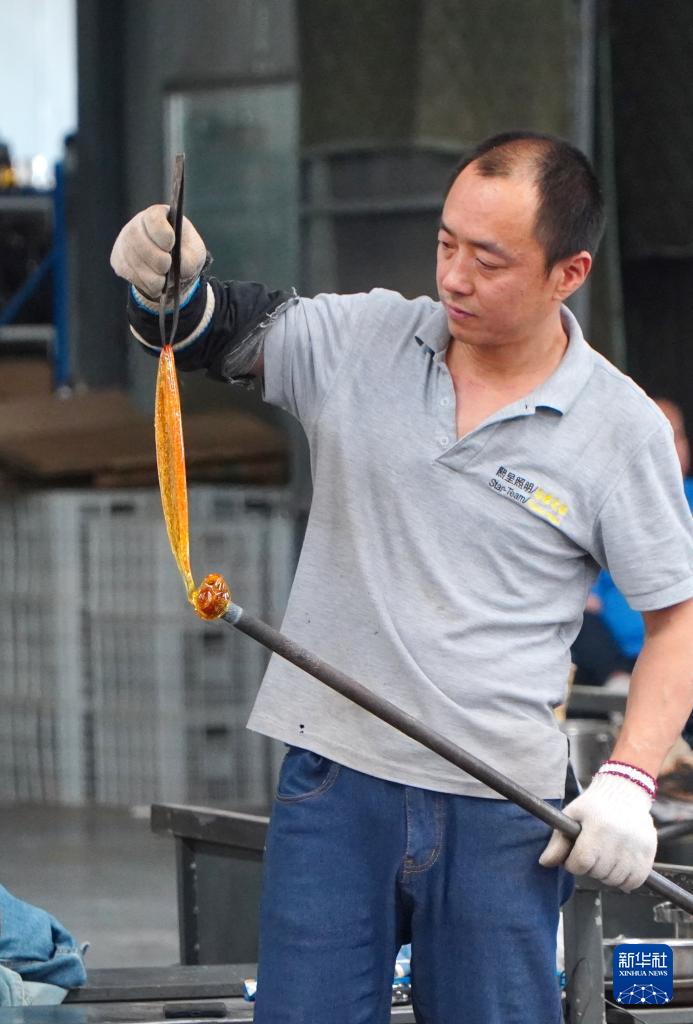 5月9日,在淄博市博山区的西冶工坊,工匠加工琉璃产品。