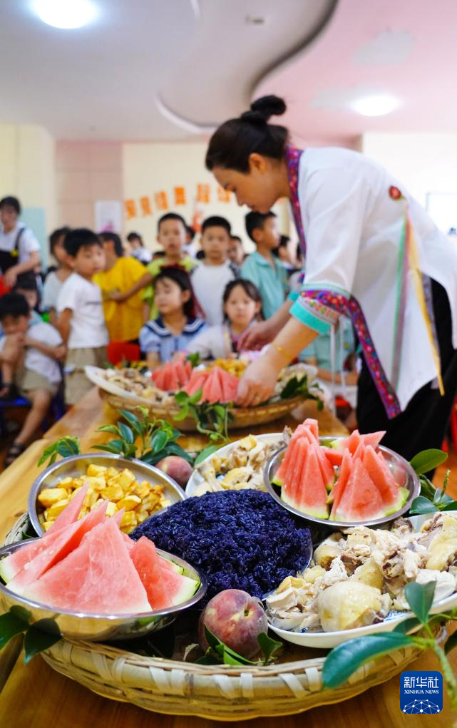 5月15日,小朋友在贵州省黔东南苗族侗族自治州从江县贝贝佳幼儿园迎“四月八”活动上品尝美食。