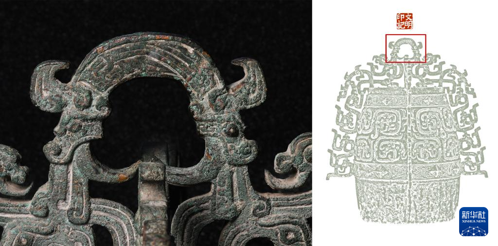 拼版照片,左图:秦公镈(一号镈)“钮”部特写(2024年1月23日摄);右图:左图画面在镈身位置示意图(红框内)。