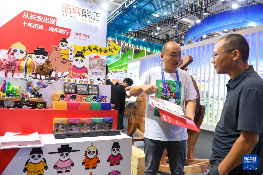 5月23日,参展商在第二十届文博会上向参观者介绍文创产品。