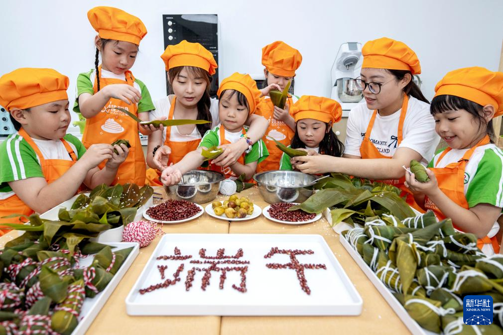 6月6日,在浙江省湖州市长兴县泗安镇中心幼儿园,孩子们在老师的指导下体验包粽子。