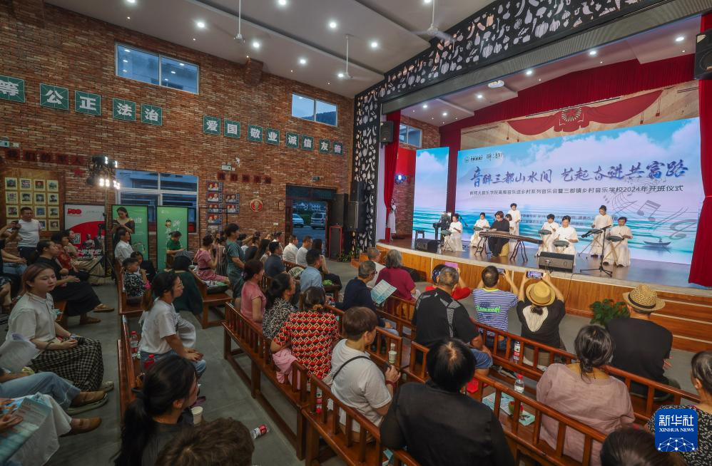 6月15日,一场别开生面的乡村音乐会在浙江省建德市三都镇镇头村文化礼堂举行,来自杭州师范大学音乐学院的师生为村民即兴演出并对村民乐队的演奏进行专业指导。这是建德市委宣传部和杭州师范大学音乐学院“人文乡村·艺术乡建”合作的首场乡村音乐会,同时也是三都镇2024乡村音乐学校开班仪式。