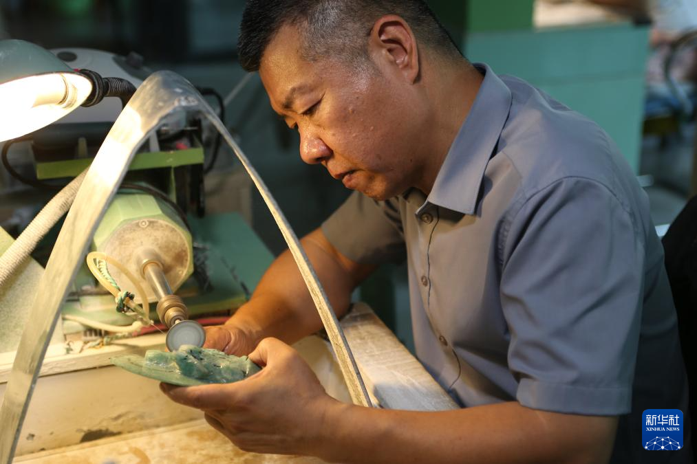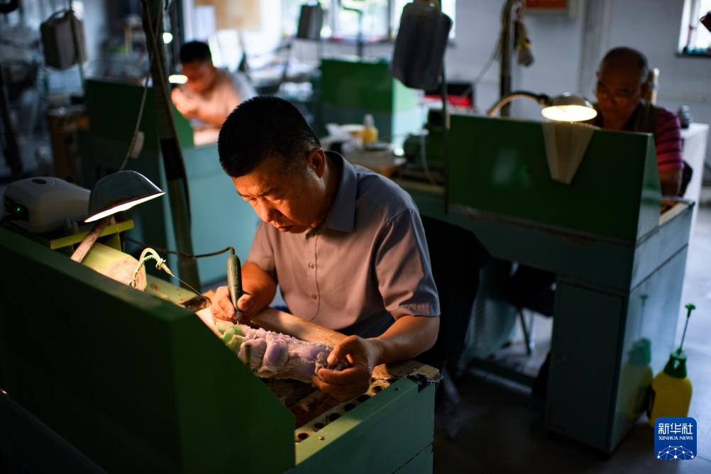 技师们在张铁成工作室内雕刻玉石(6月15日摄)。