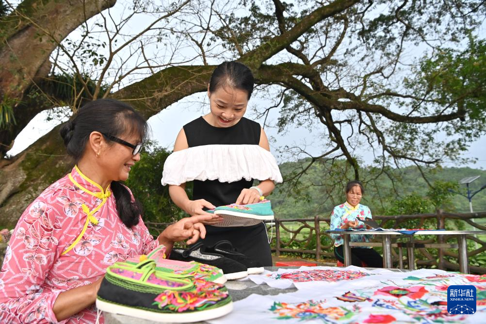 凌漫丽(右)在田东县义圩镇朔晚村跟村民探讨绣品花样(8月20日摄)。