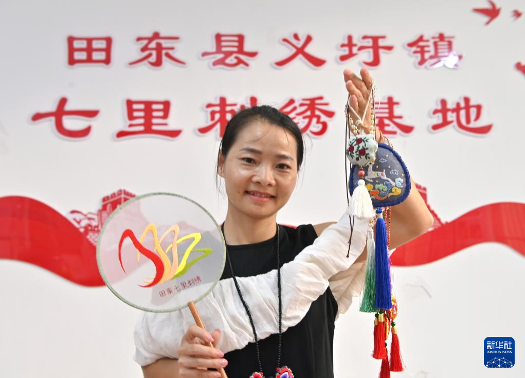 凌漫丽在田东县义圩镇七里刺绣基地展示她和村民制作的工艺品(8月20日摄)。