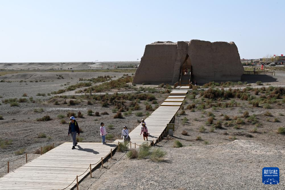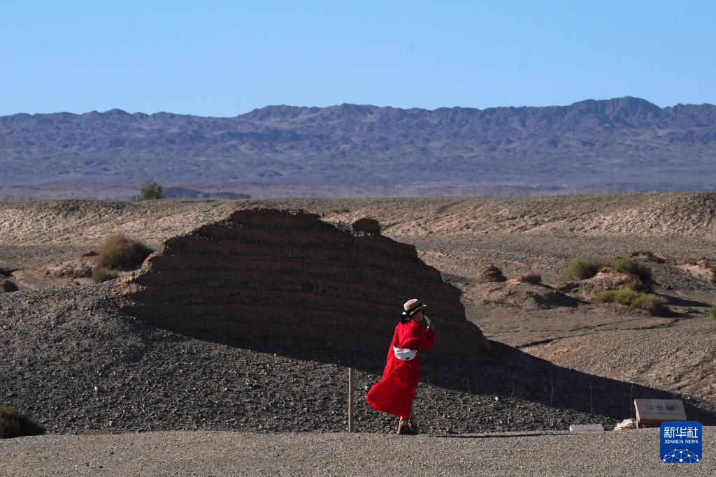 8月25日,游客在甘肃省敦煌市玉门关遗址区参观小方盘城。