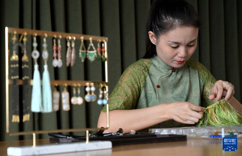 楚蒙丹在位于洛阳市的非遗体验馆里搭配珍珠辑珠胸针(9月12日摄)。