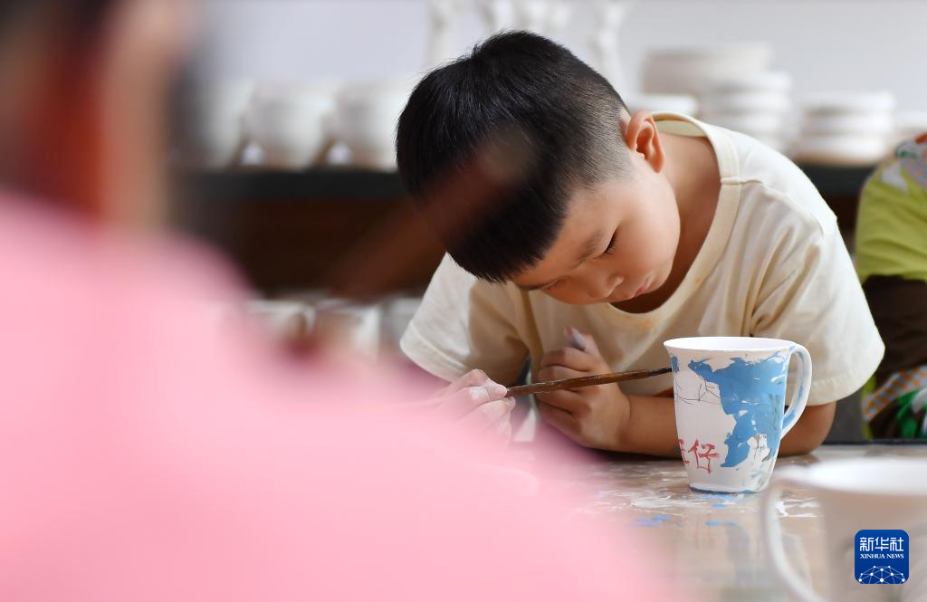 9月27日,在醴陵市一家陶瓷企业的游客体验区,一名小朋友在陶瓷坯体上涂鸦。