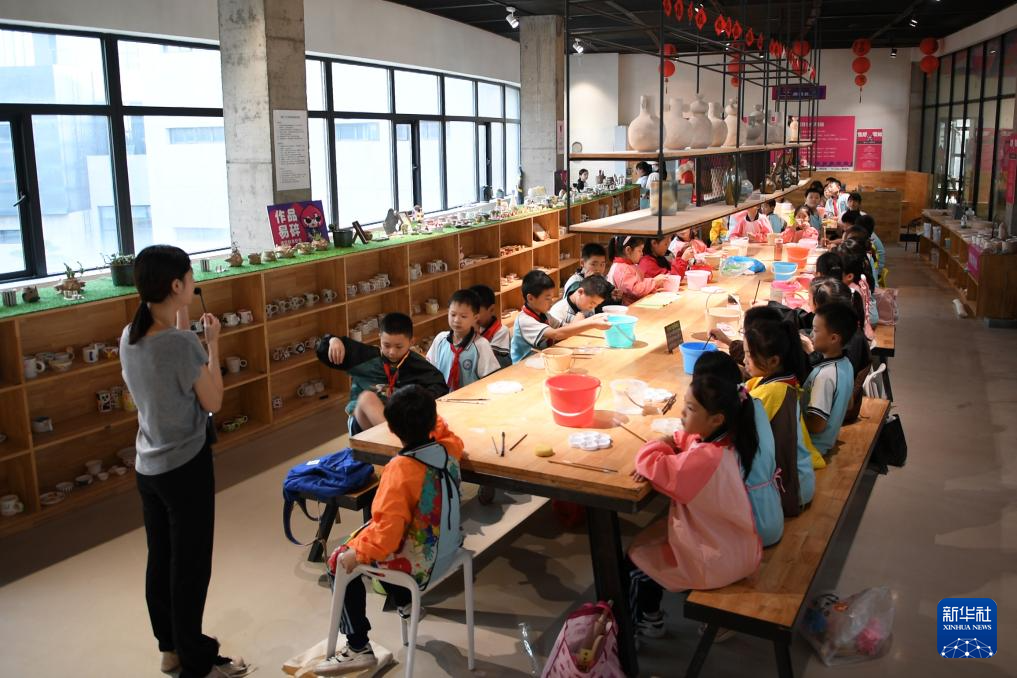 9月27日,在醴陵市一家陶瓷企业,多名小学生在参与陶瓷制作体验课程。