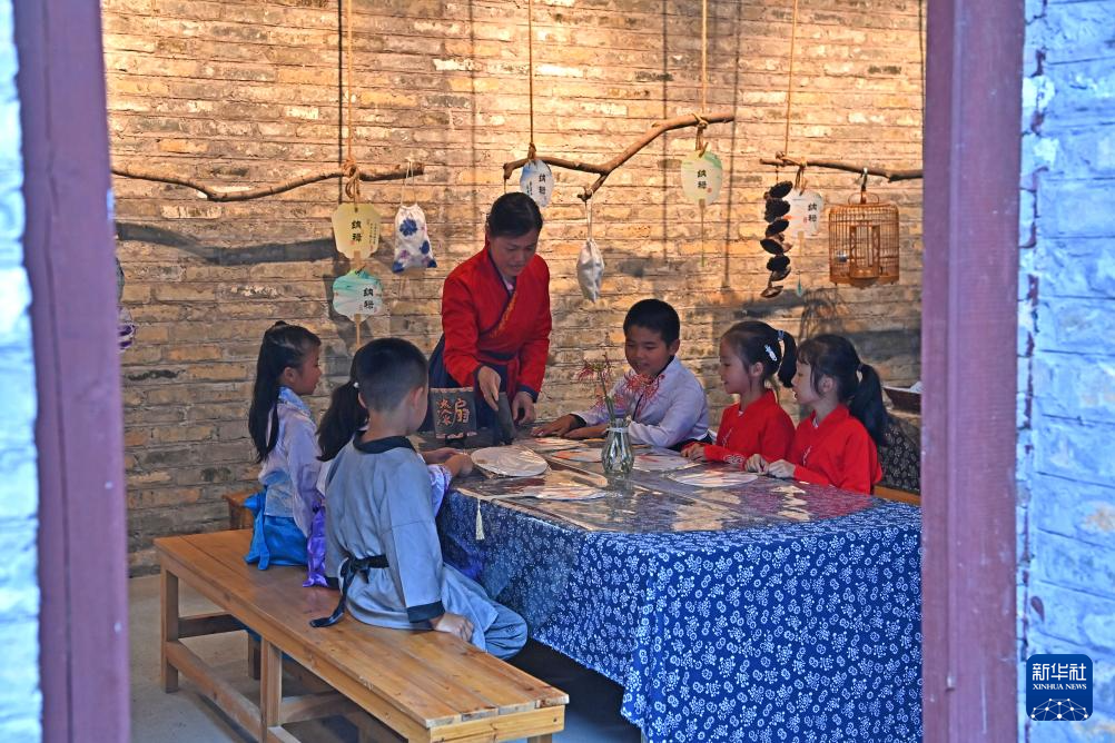 一名老师带着几名孩子在广西来宾市象州县罗秀镇纳禄村的古学堂里体验(10月10日摄)。