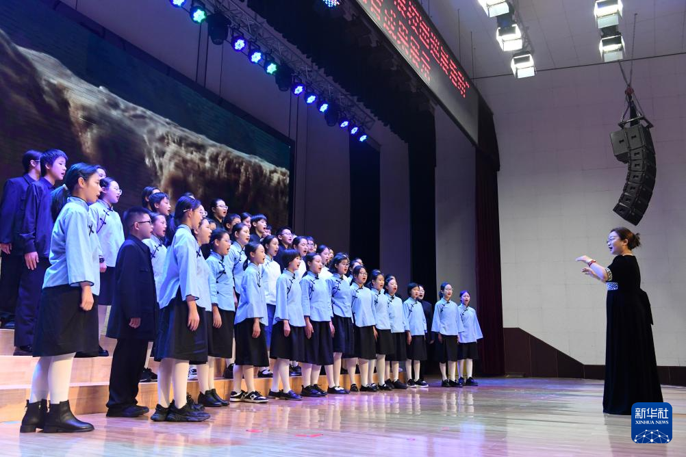 11月13日,在北京市第四中学顺义分校活动现场的思政课上,北京四中顺义分校合唱团演唱《保卫黄河》。