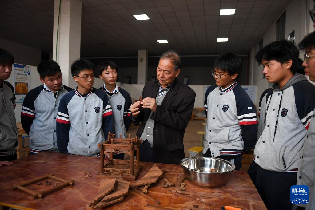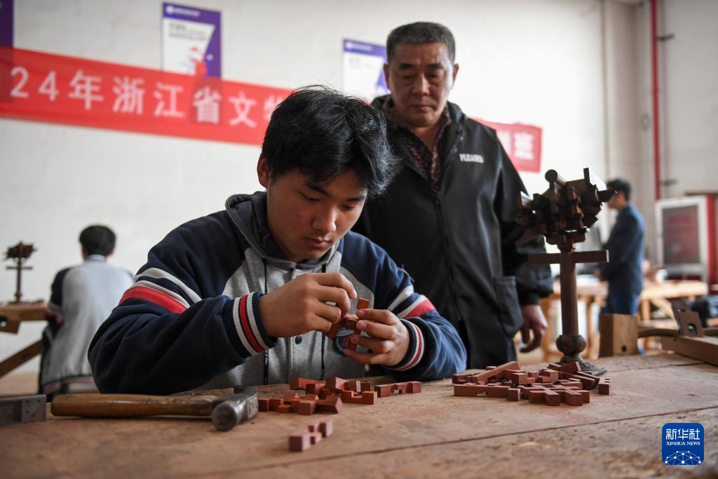 11月22日,在临海市海商职业技术学校,学生在资深工匠的指导下学习制作鲁班锁。