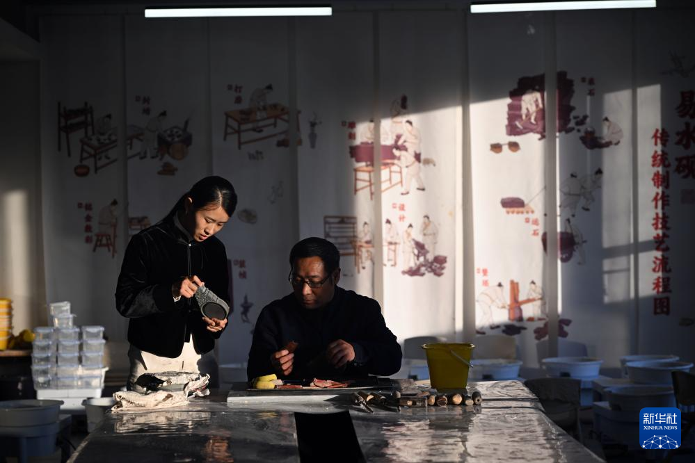 11月25日,邹天然(左)与砚雕师傅在工作室内交流。