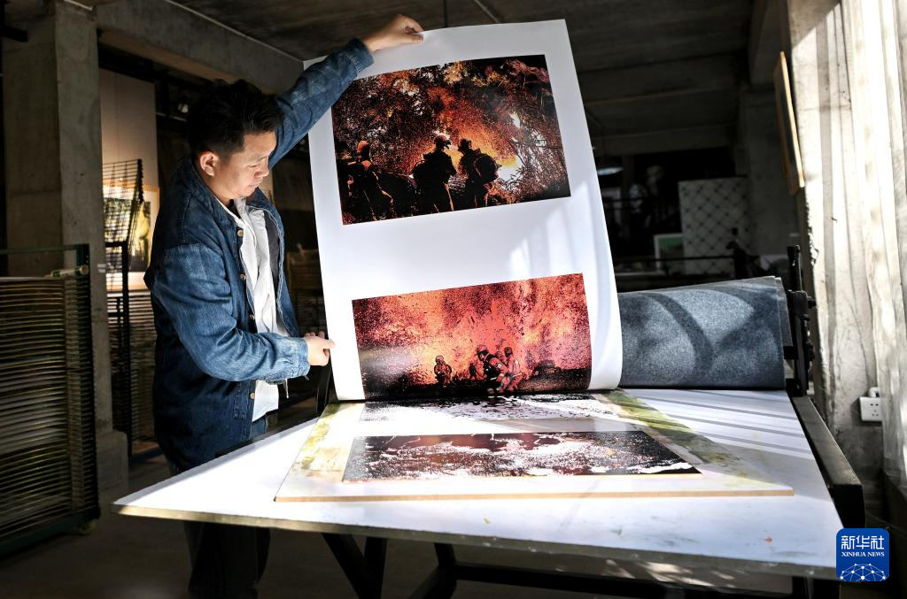 12月9日,在云南普洱学院那柯里绝版木刻教学实践基地,基地负责人、绝版木刻画家冷光冕展示印好的作品。
