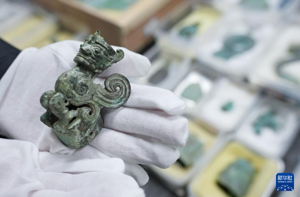 12月16日,三星堆研究院工作人员展示一件青铜文物。