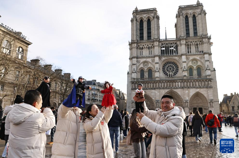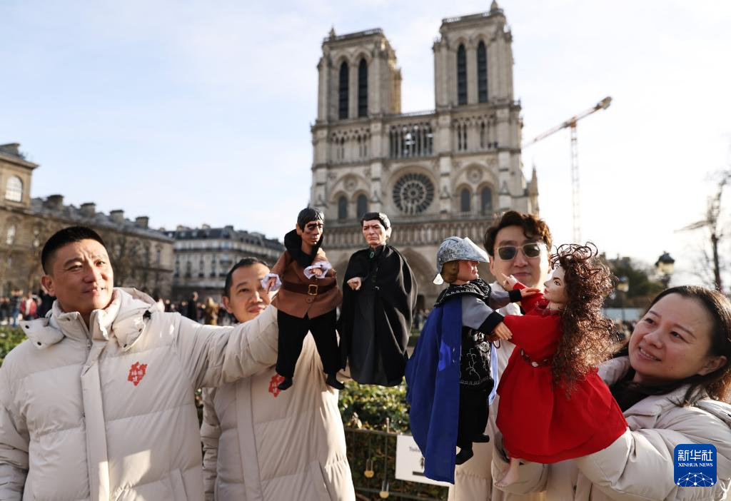 12月15日,在法国巴黎圣母院前,游客体验布袋木偶。