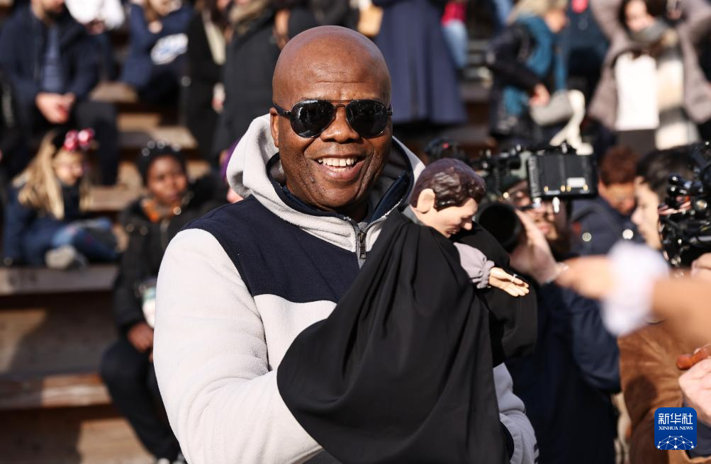 12月15日,在法国巴黎圣母院前,一名游客体验布袋木偶。