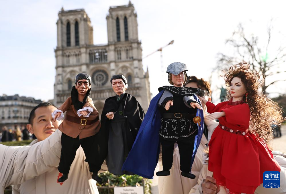 12月15日,在法国巴黎圣母院前,来自中国福建展演团的演员表演布袋木偶戏《巴黎圣母院》。
