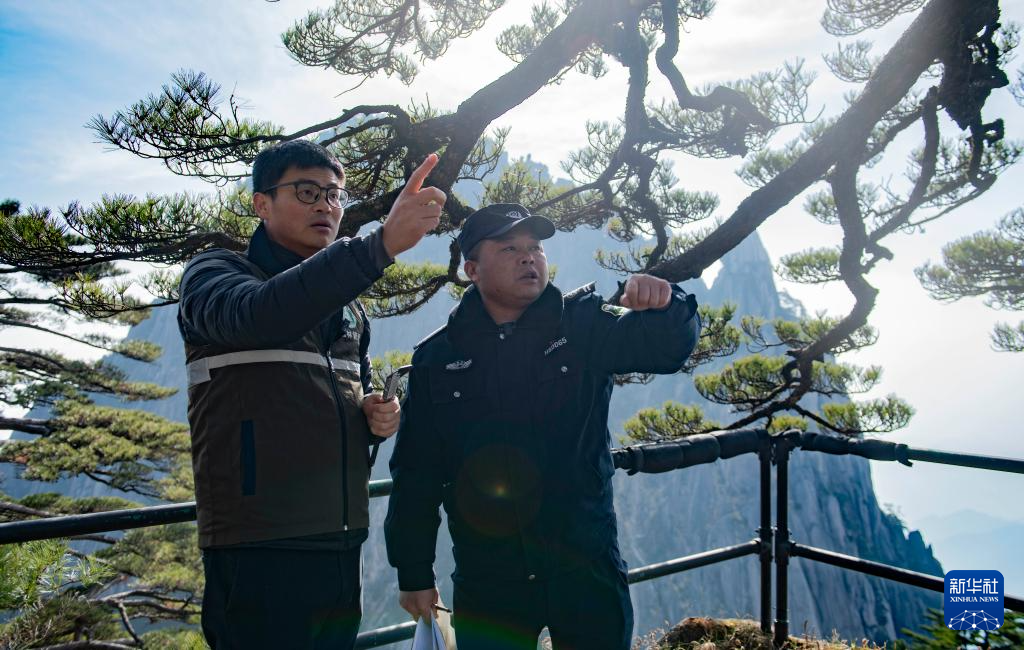 12月18日,“守松人”胡晓春(右)和黄山风景区管委会园林局高级工程师吴贻军讨论迎客松生长情况。