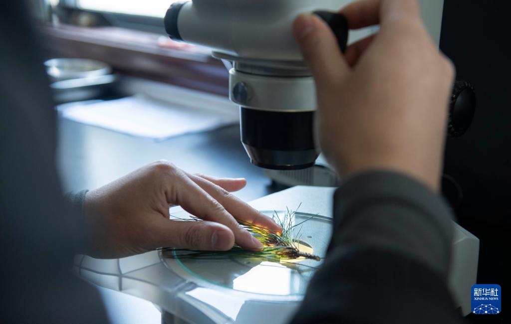 12月20日,黄山风景区管委会园林局高级工程师吴贻军在检验检疫室里观察松针样本。