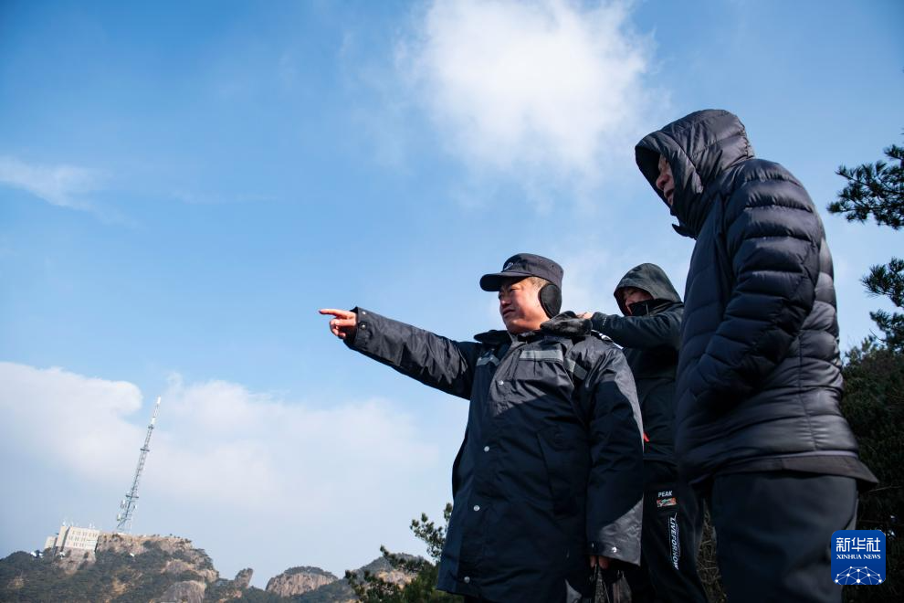 12月18日,黄山风景区管委会园林局瞭望哨防火小队队长秦志平(左一)在景区内为游客指路。