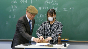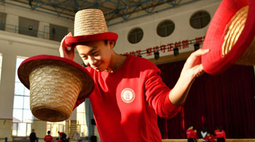 12月21日,观众在展厅内互动体验传统节日项目——投壶。