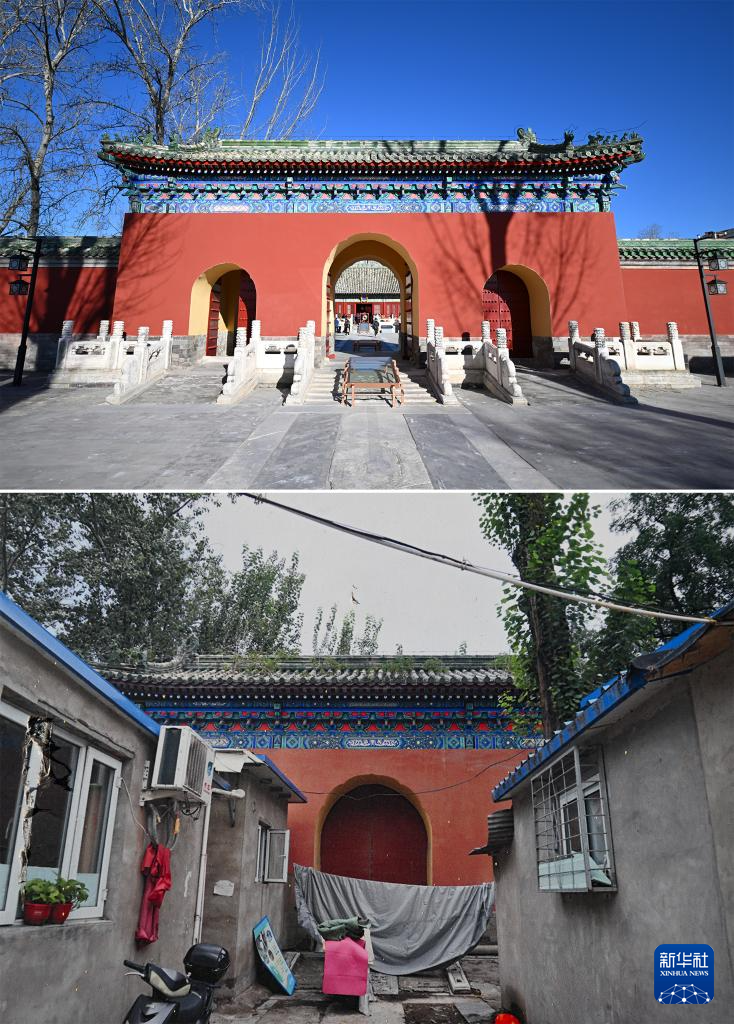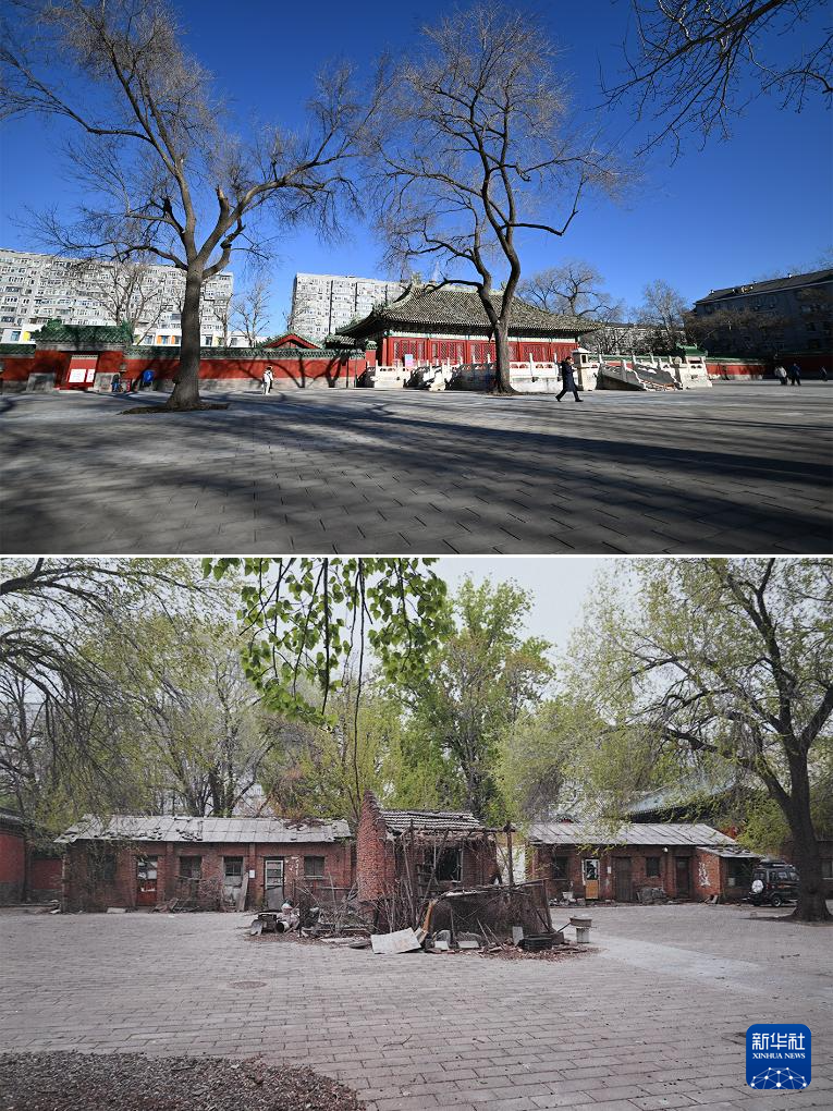 拼版照片:上图为腾退修缮后的庆成宫正殿东侧区域;下图为翻拍的庆成宫正殿东侧区域腾退修缮前的资料照片(12月21日摄)。