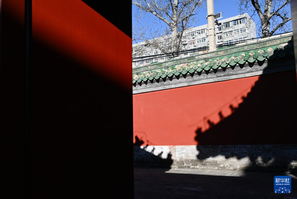 12月21日冬至日,阳光在红墙上照射出庆成宫屋顶和脊兽的影子。