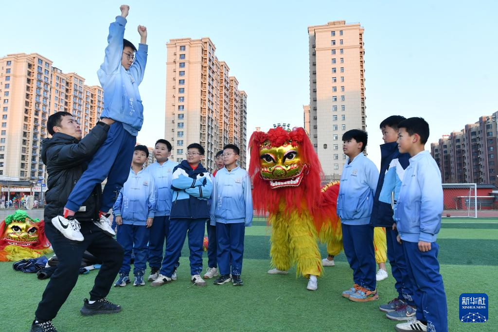 12月20日,河北省沧州市重庆路小学舞龙舞狮社团的学生们在舞狮艺人的指导下学习舞狮动作。