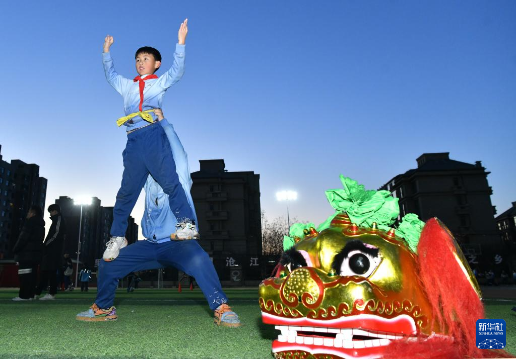 12月20日,河北省沧州市重庆路小学舞龙舞狮社团的学生们在练习舞狮动作。