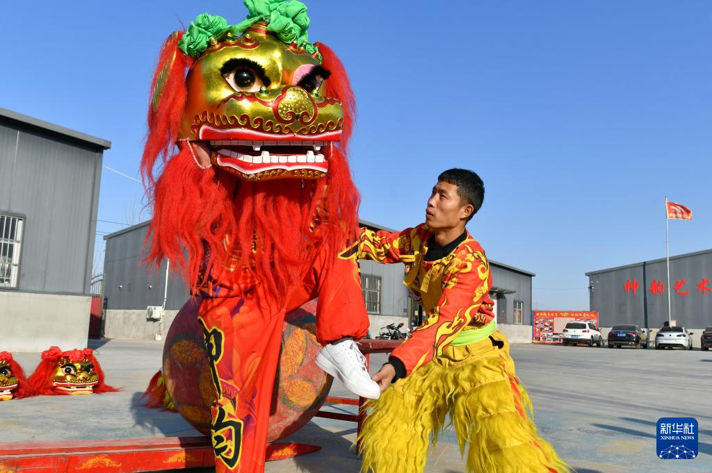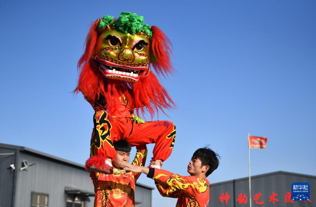 12月20日,河北省沧州市沧县神韵舞狮传承基地的学员在练习舞狮动作。