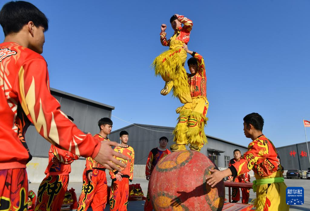12月20日,河北省沧州市沧县神韵舞狮传承基地的学员们在进行狮子滚绣球训练。