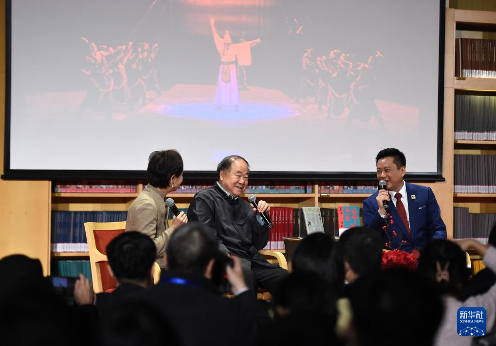 12月22日,作家莫言(中)和国家大剧院副院长王斑(右)在“从文字到舞台——莫言戏剧作品分享会”上畅谈。